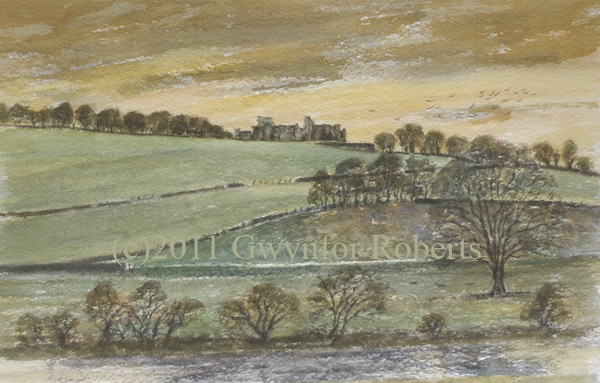 This watercolour evening scene, shows the viewer looking up to Goodrich Castle from the River Wye.